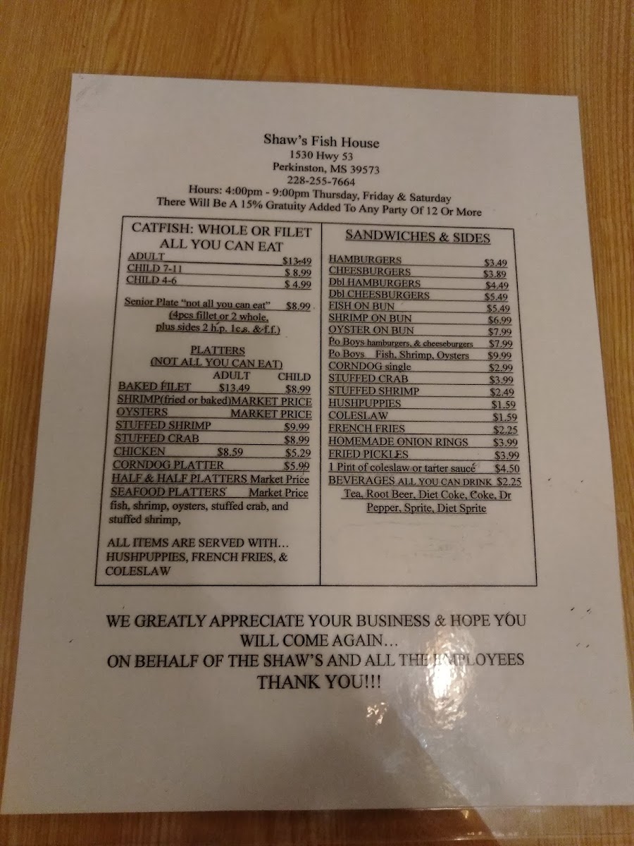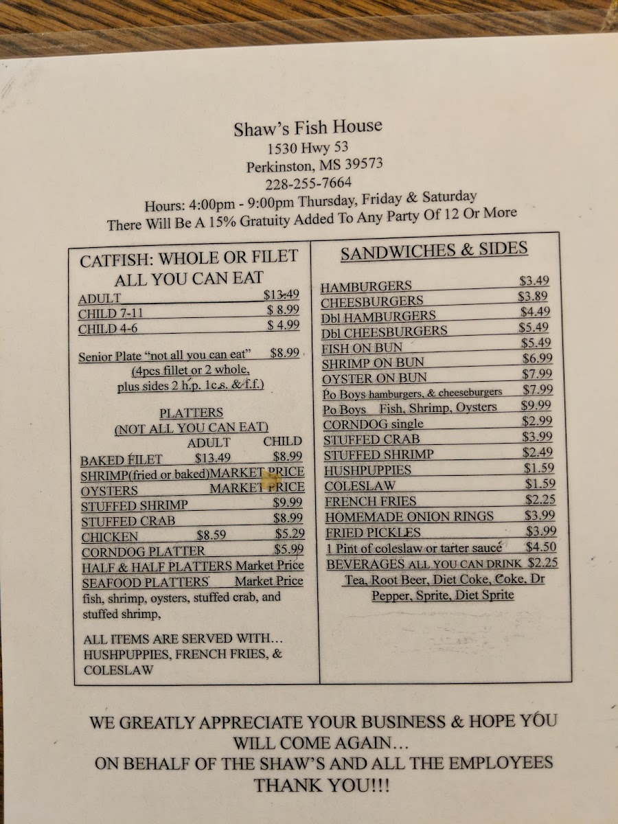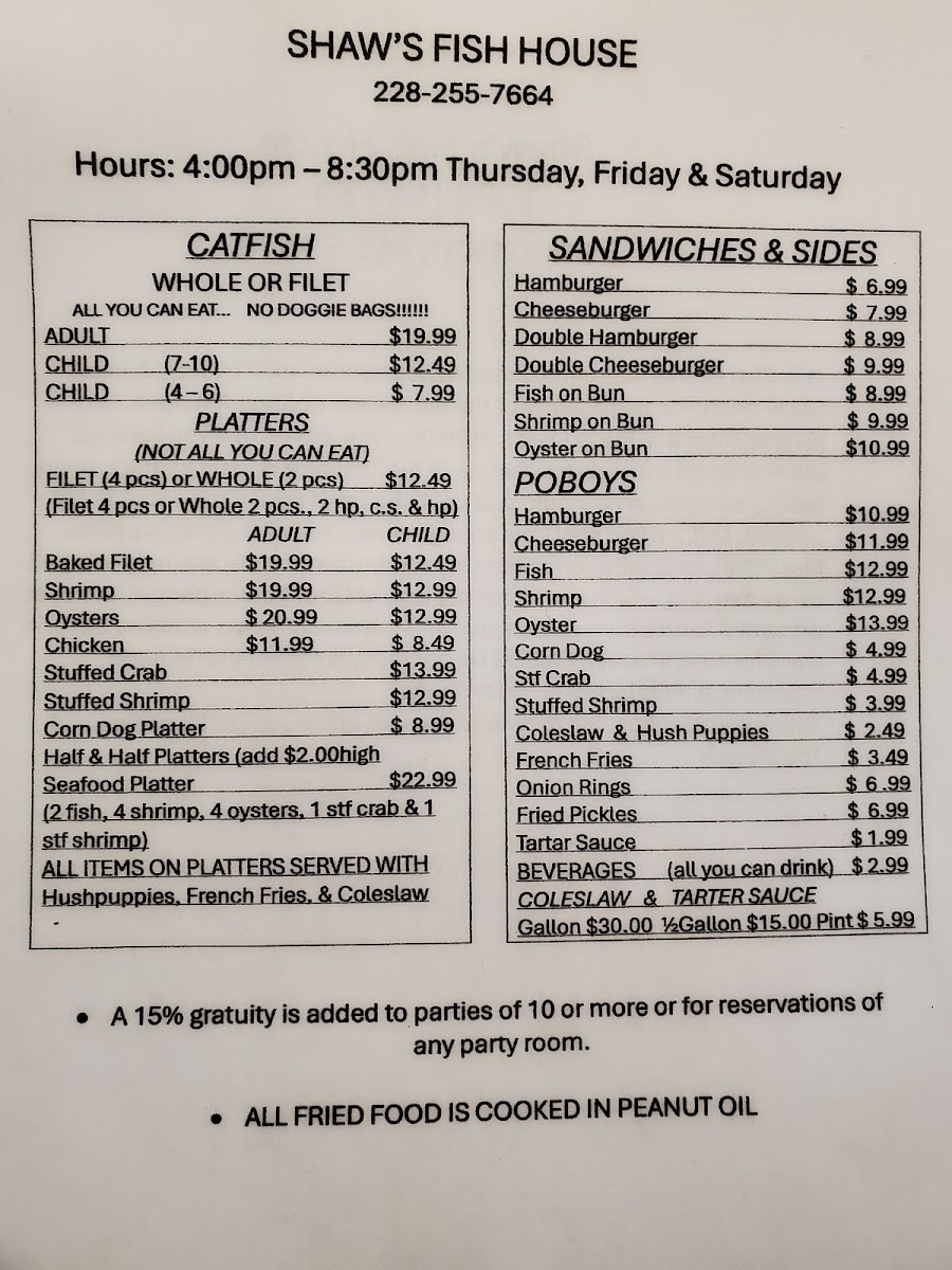 Shaw's Fish House offers a straightforward menu that reflects its casual, down-to-earth atmosphere. The focus here is on hearty, comforting seafood and classic Southern-style sides, making it an ideal spot for a relaxed lunch or a family dinner after a day on the road.